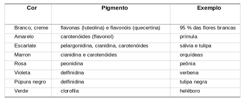 As antocianinas conferem a coloração vermelha, púrpura ou violetade alguns frutos. A variação de pH tecidual também influi, induzindo uma pigmentação vermelha em meio ácido, amarela em pH neutro, e azul, quando em ambiente alcalino. A coloração azul também é resultante da complexação do pigmento com proteínas e metais. Finalmente, as antoxantinas, típicas de flavonóides, contribuem pouco para a pigmentação vegetal, à excessão de sua oxidação, a qual resulta em compostos escurecidos nos tecidos.