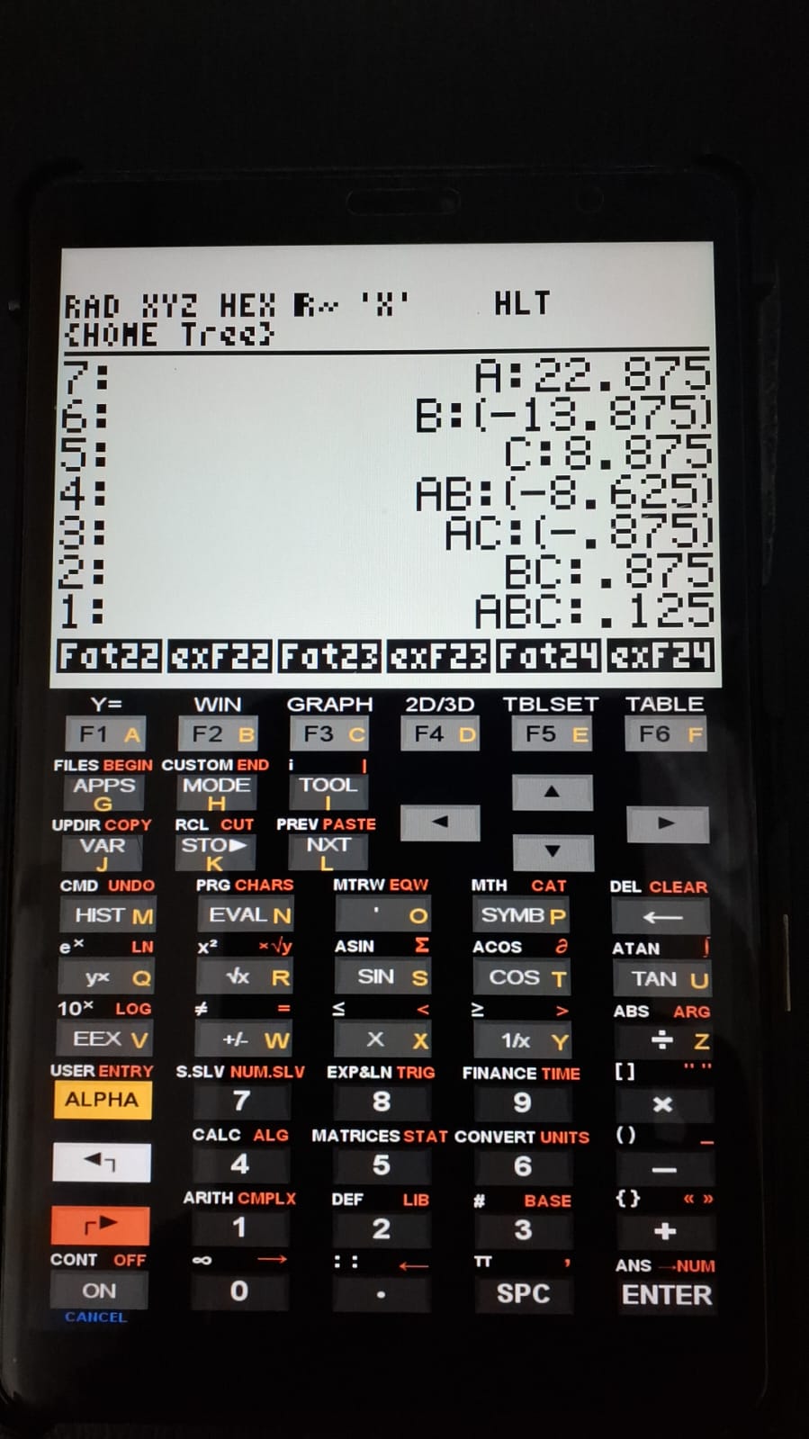 1. Values of M, A, B, C, AB, AC, BC, and ABC.