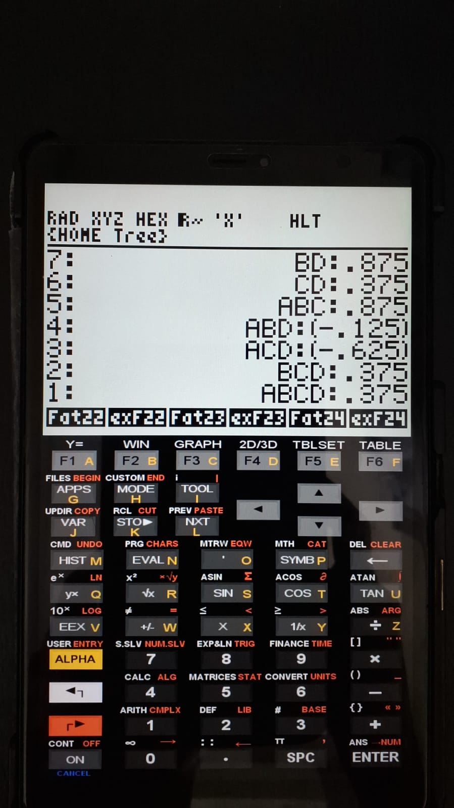 1. Values of M, A, B, C, D, AB, AC, AD, BC, BD, CD, ABC, ACD, BCD, and ABCD.