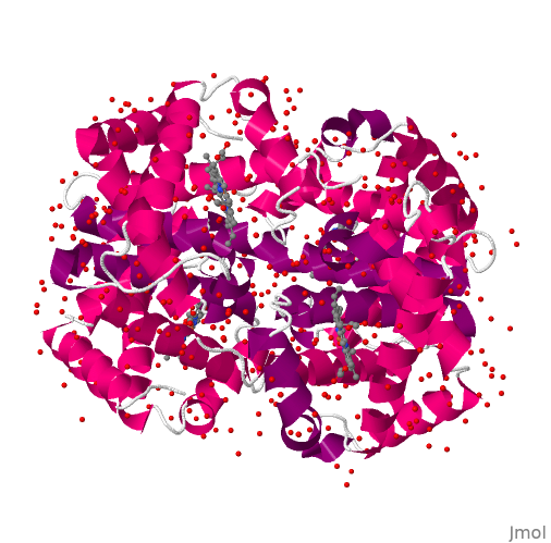 Now rotate the structure and notice how many water molecules (in red, represented by oxygen) are strongly adsorbed to the protein crystal, affecting its X-ray diffraction pattern.