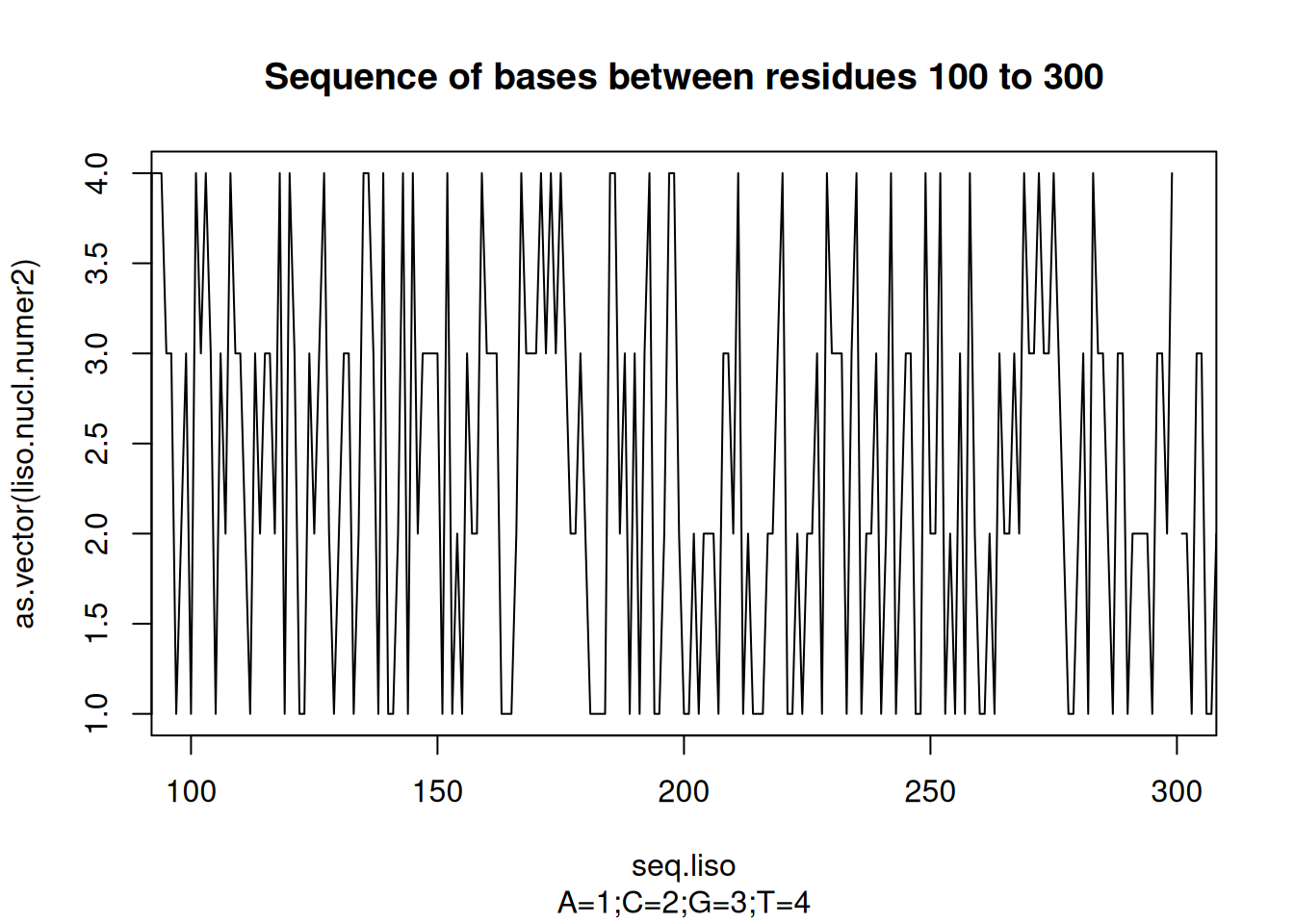 # Note: can also be obtained by the s2n and n2s functions of the seqinr packageseq.liso <-seq(1:length(liso.nucl))plot(seq.liso, as.vector(liso.nucl.numer2),type ="l",xlim =c(100, 300), main ="Sequence of bases between residues 100 to 300",sub ="A=1;C=2;G=3;T=4")