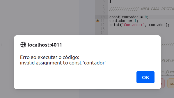 print("Contador:", contador); Agora substitua a variável do “contador” para const ao invés de let. O resultado incorrerá no erro abaixo: