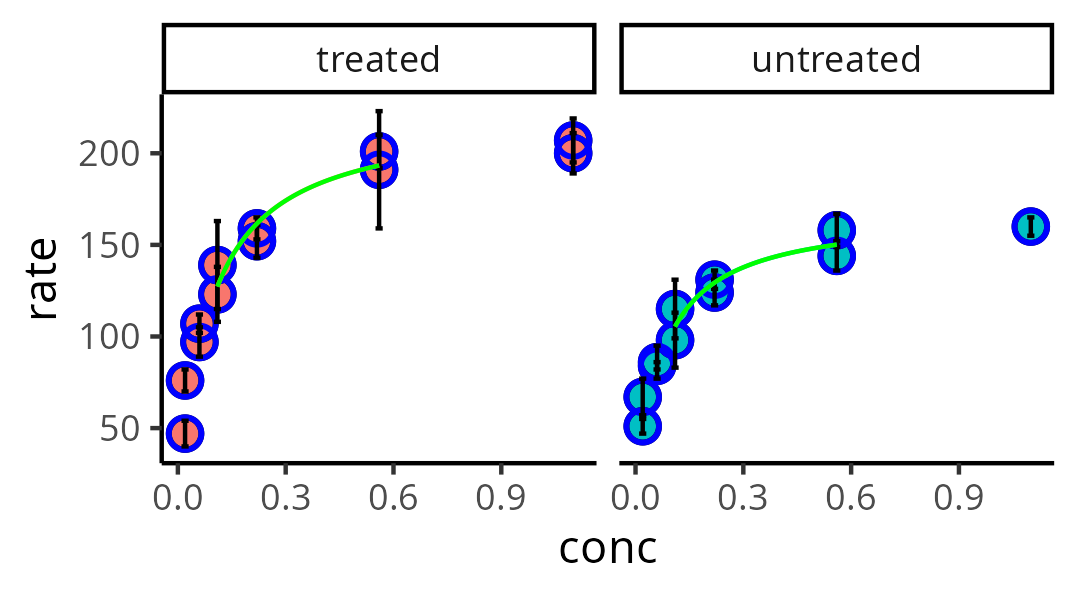 Observe que o gráfico apresenta a inserção de 1) dados multivariados, com 2) símbolos e 3) espessura definida, 4) tipos distintos, 5) preenchimento e 6) cores distintas para cada subconjunto, 7) barras de erro, 8) disposição em painel, 9) configuração e tema específicos, e 10) ajuste não linear em subconjuntos para cada nível dos dados, e por equação introduzida pelo usuário.