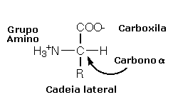 A fórmula ionizada geral dos aminoácidos é a representada à Figura 5.1, onde R representa uma cadeia lateral que distingue um aminoácido de outro, e o carbono \(\alpha\), o carbono assimétrico ou quiral, e que confere à estrutura dos aminoácidos a sua atividade óptica. Em plantas e animais, os aminoácidos desviam a luz plano polarizada à esquerda, sendo portanto denominados L-aminoácidos (levrógiro, diferente de D, dextrógiro, aminoácidos típicos de paredes bacterianas).