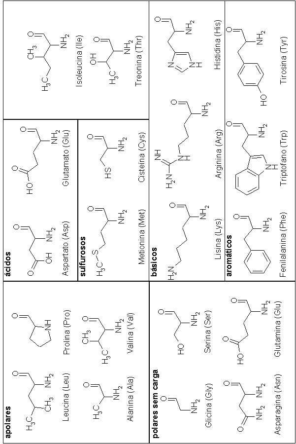 Em plantas folhosas e leguminosas pode-se encontrar D-aminoácidos e oligopeptídios. Conforme a estrutura da cadeia lateral, temos aminoácidos básicos (lisina, arginina e histidina, todos positivos em solução fisiológica), ácidos (aspartato e glutamato, negativos na mesma solução), polares sem carga (asparagina, glutamina, serina, treonina, cisteína, prolina), apolares alifáticos (glicina, valina, alanina, leucina, metionina, isoleucina), e apolares aromáticos (triptofano, tirosina e fenilalanina). De modo geral, os aminoácidos são bastante solúveis em água (excessão para os aromáticos). A Figura 5.2 ilustra as estruturas químicas dos 20 aminoácidos proteicos.