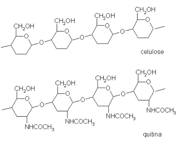 A quitina, do exoesqueleto de crustáceos e insetos, é formada por polímeros de glicose com N-acetilglicosamina ligada. A hemicelulose é formada pela celulose ligada à lignina, um polifenol do lenho vegetal. A extremidade OH livre do carbono anomérico também permite algumas reações de redução sobre metais (açúcares redutores), produzindo compostos cromáticos que identificam o tipo de açúcar envolvido na reação (reação de Fehling ou de Benedict). A Figura 56.4 mostra diferenças estruturais entre os polímeros de celulose e quitina.