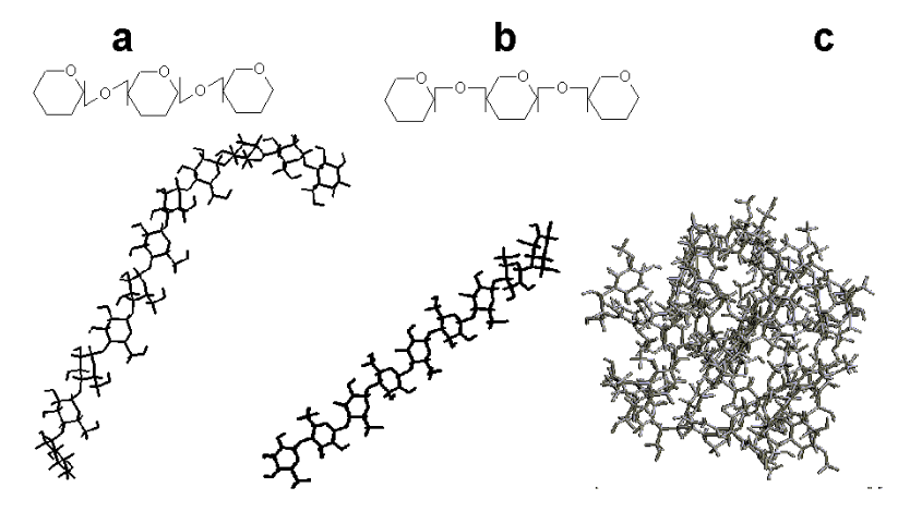 Esses últimos, geralmente formados por uniões de glicose, como a celulose (\(\beta\)-1,4), o amido (\(\alpha\)-1,4 e \(\alpha\)-1,6 nas ramificações - a cada 30 resíduos) e o glicogênio (\(\alpha\)-1,4 e \(\alpha\)-1,6 nas ramificações - a cada 10 resíduos), possuem diferenças estruturais apenas naquelas ligações. Essa diferença permite que ruminantes possam degradar a celulose, por possuirem enzimas adequadas (microorganismos ruminais), e monogásticos não.