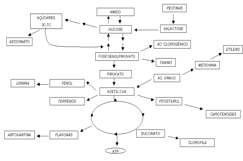 Frutos são distintos em cor, aroma, textura, suculência, e sabor. Estas características são produzidas por diversos processos bioquímicos e fisiológicos que envolvem hormônios específicos do amadurencimento dos frutos, interligados ao conjunto de rotas bioquímicas já tratadas nos capítulos anteriores. Assim, participam do metabolismo de frutos a fermentação e as rotas oxidativas mitocondriais, para obtenção de energia (as duas últimas predominantes na maturação do fruto), a via das pentoses (para produção de açúcares variados), a síntese de proteínas e a degradação de lipídios. Paralelamente, os frutos possuem um alto valor de interconversão de açúcares e metabólitos após a colheita.
