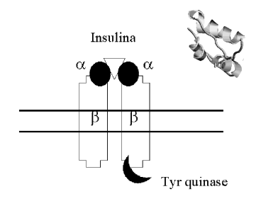 Figura 36.1: Representação esquemática do receptor de insulina integrado à membrana citoplasmática, mostrando o domínio de fosforilação da tirosina quinase, essencial para a transdução de sinais mediado pela interação do receptor com o hormônio. Ao alto e à esquerda, um dímero de insulina.