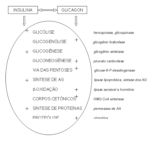 Figura 36.3: Regulação metabólica das diversas rotas bioquímicas por insulina e glicagon.