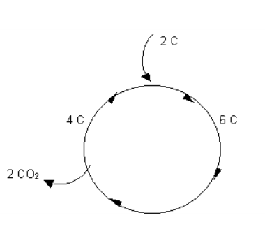 Quimicamente falando, se olharmos para o ciclo de Krebs, veremos na sequência de reações um composto com 4 carbonos se transformando em outro com 6 carbonos. Como isso é possível, ou seja, como um 4C pode virar um 6C? Ora, só se receber mais 2 carbonos (4C+2C=6C). Acontece que o ciclo é cíclico por definição, o que faz com que esse composto 6C tenha que se transformar novamente em 4C, fechando o ciclo. Neste caso, há a perda de 2 carbonos, que no ciclo de Krebs vão embora na forma de duas moléculas de dióxido de carbono, ou 2 CO2. Durante o ciclo são produzidas também algumas coenzimas especiais (ajudantes de enzimas), as quais podem ser utilizadas pela etapa seguinte do metabolismo intermediário, a cadeia respiratória, para formar uma enorme quantidade de ATP energético para a célula.