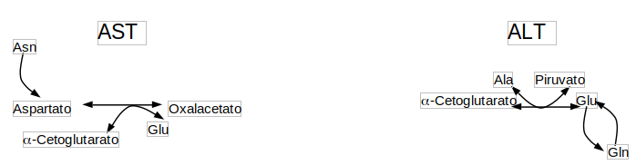 | Assim, a ALT combina-se a uma Ala, associa-se a um \(\alpha\)-cetoglutarato, e libera um Glu mais um piruvato. A AST, por sua vez, combina-se a um Glu, associa-se a um \(\alpha\)-cetoglutarato, e libera um Asp mais um oxalacetato. A AST requer vitamina B6, piridoxal-P, como coenzima, a qual pode ser encontrada em quase todo alimento, como trigo, milho, gema de ovo, fígado, carne, batata, vegetais verdes e frutas cítricas. ALT e AST possuem valor diagnóstico, já que um aumento destas no plasma indicam lesão de células ricas nessas enzimas, como fígado (necrose celular extensiva e hepatite viral, coração (infarto do miocárdio) e músculo. A transaminação só não ocorre com Lys.