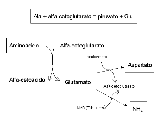 - Lógica da via: transaminação (ALT, Ala aminotransferase; AST, Asp aminotransferase) e desaminação (Glu desidrogenase);