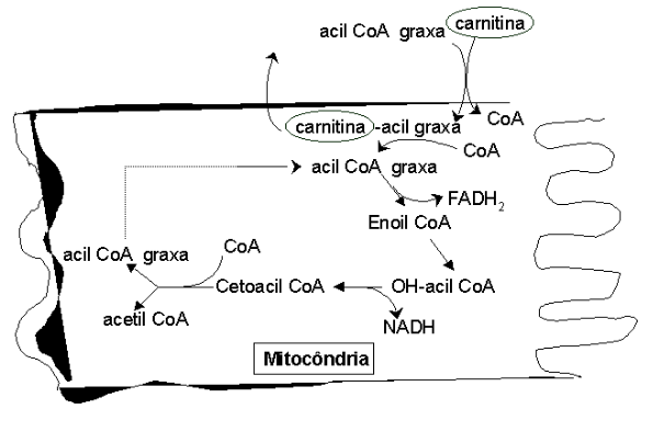 - Transporte mitocondrial (carnitina leva ácido graxo do citosol à matriz mitocondrial);