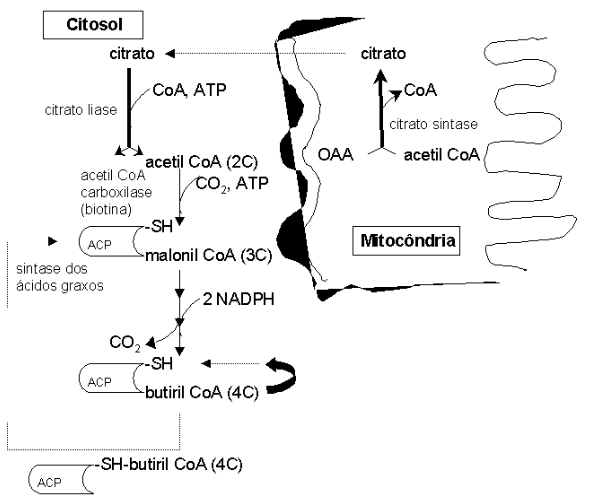 Posteriormente, ocorre alongamento da cadeia e dessaturação, essa última produzindo ácidos graxos insaturados. A etapa inicial de síntese envolve uma doação de acetato da acetil CoA. Como esta faz parte do metabolismo intermediário na mitocôndria, precisa ser transportada para o citosol para continuidade da síntese. Neste caso, ocorre uma condensação de acetil CoA e oxalacetato mitocondrial em citrato (citrato liase), o qual é exportado para o citosol, e novamente re-oxidado (citrato liase).