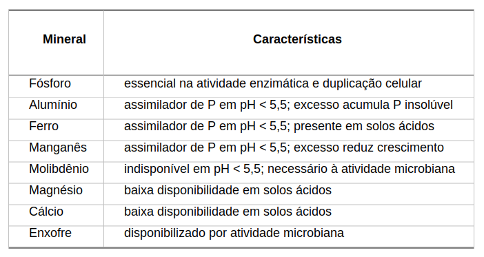 O controle de pH nos solos é de vital importância para a manutenção da atividade microbiana, cuja otimização entre 6,0 e 6,5 unidades de pH desencadeia os processos de decomposição da matéria orgânica e fixação de nitrogênio, com consequente disponibilidade aumentada de nutrientes. Por outro lado, teores de acidez e alcalinidade indesejáveis para os solos estão intimamente relacionados à solubilidade e disponibilização reduzida de alguns minerais às plantas (vide tabela abaixo).