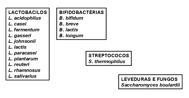 Figura 52.1: Alguns exemplos de probióticos empregados na formulação de alimentos funcionais, entre bactérias e leveduras.