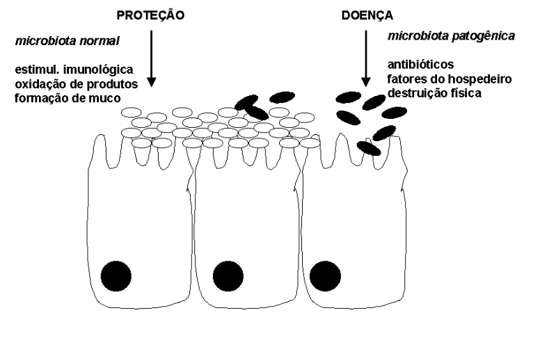 Figura 52.3: mecanismo de bloqueio físico e bioquímico durante a colonização epitelial de probióticos no sistema gastrintestinal.