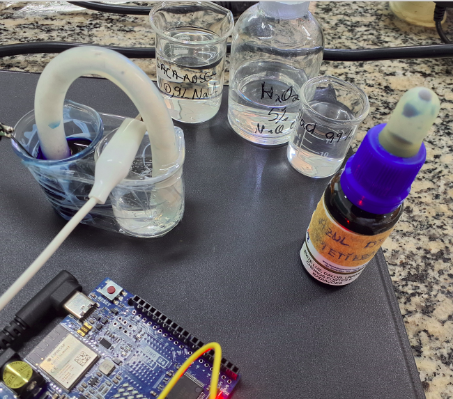 O experimento ilustrado acima pode ser conduzido também junto a módulos para conexão Bluetooth ou Wifi presentes em algumas placas microcontroladoras, permitindo expandir-se ainda mais as aplicações práticas do simulador e da biblioteca Plotly.js para uso com tablets e celulares. A imagem que segue ilustra um experimento conduzido com biocélula a combustível, e interfaceada por rede Wifi para uma placa Arduino Uno R4 Wifi.