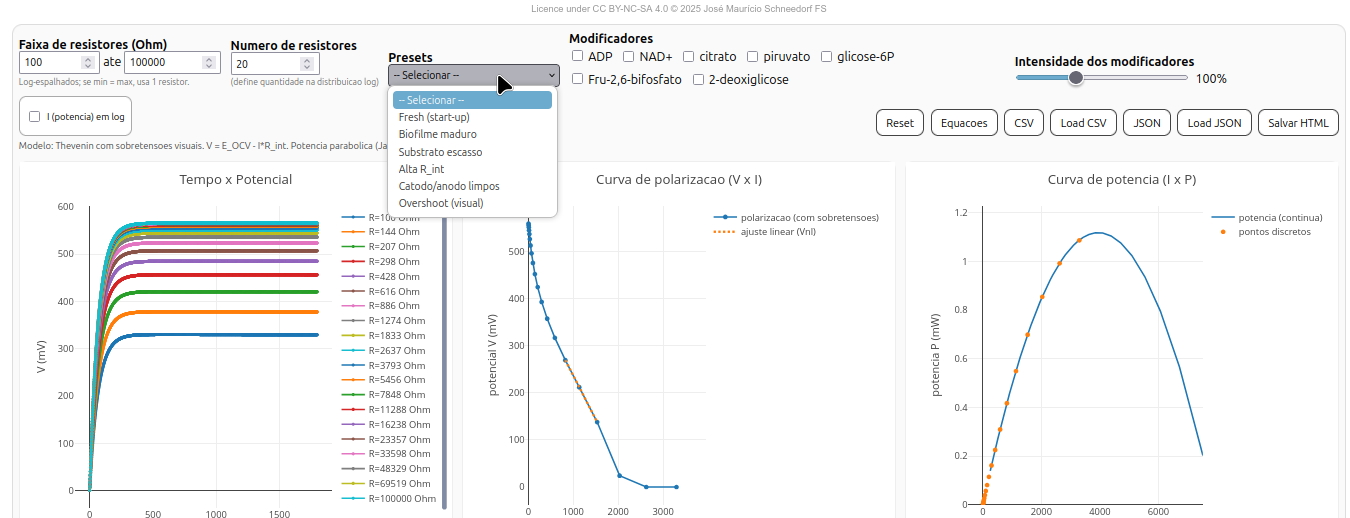 4. Experimente o perfil das curvas com alguns dos "Presets" experimentais (biofilme maduro, excesso de substrato, etc), e avalie o efeito das condições no desempenho eletroquímico apresentado nos gráficos e resultados.