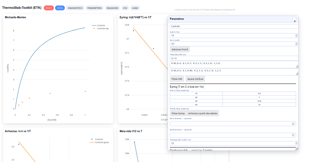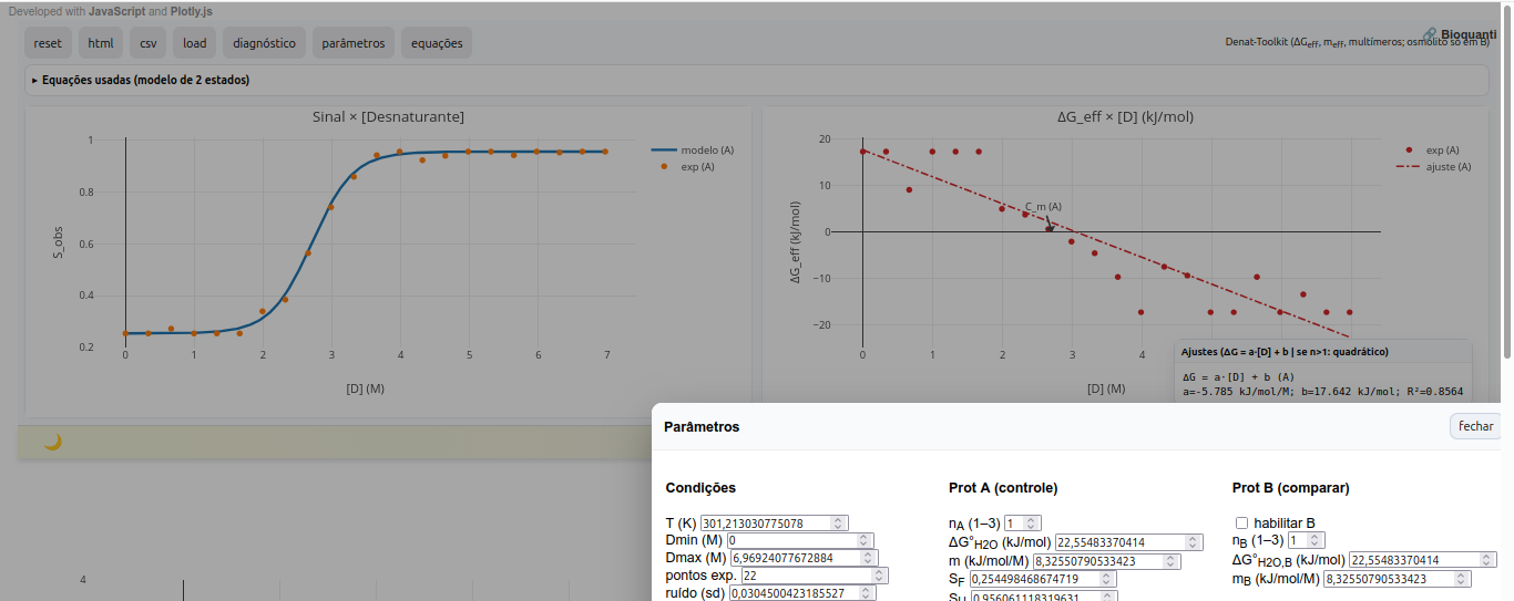 Como para os tookits anteriores, parte a interatividade cedida pelo simulador permite exportar e reimportar dados experimentais (CSV/JSON), e gerar um arquivo autossuficiente com gráficos interativos e diagnósticos (Salvar HTML), e reinicializar para uma nova configuração (Reset),
