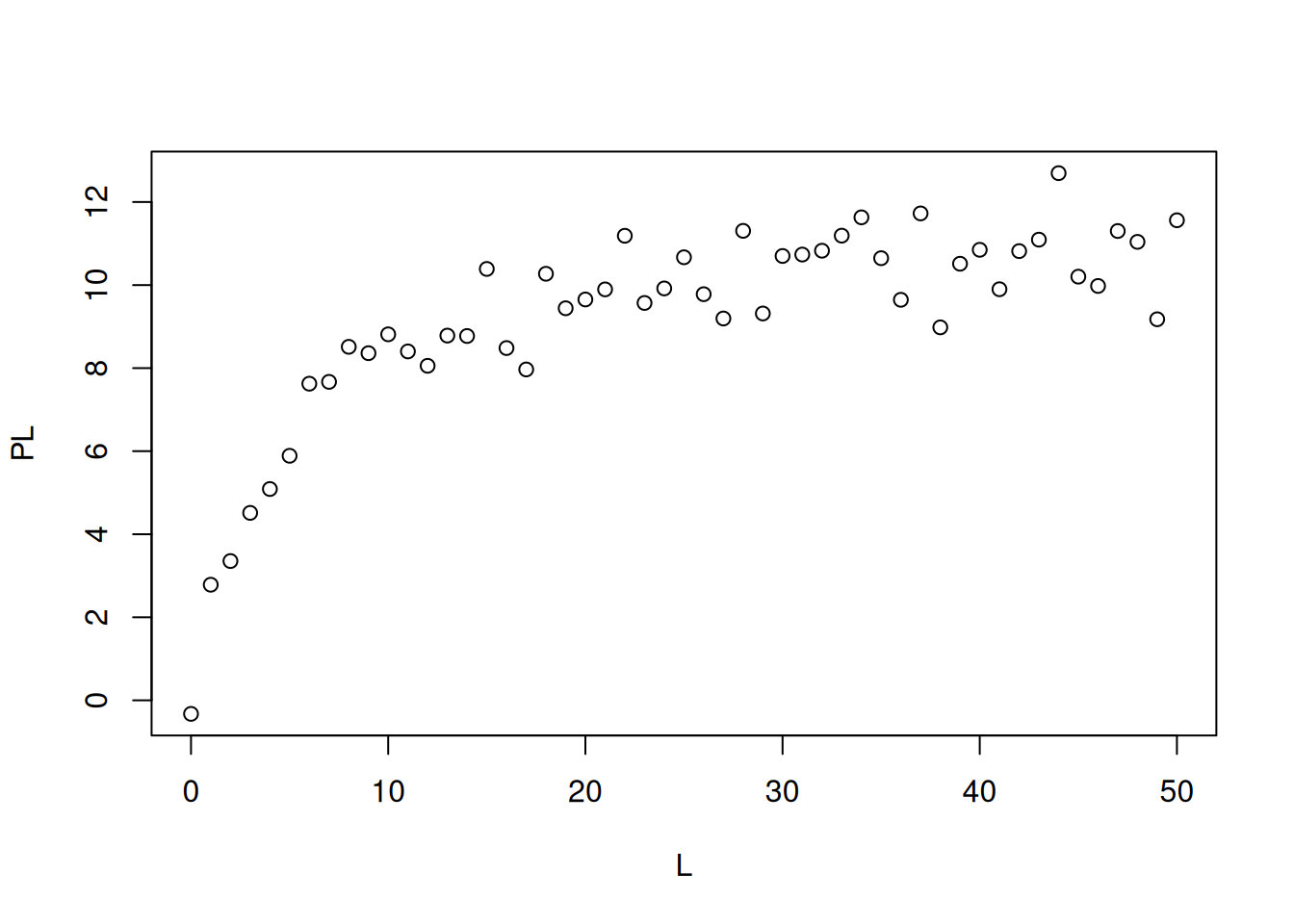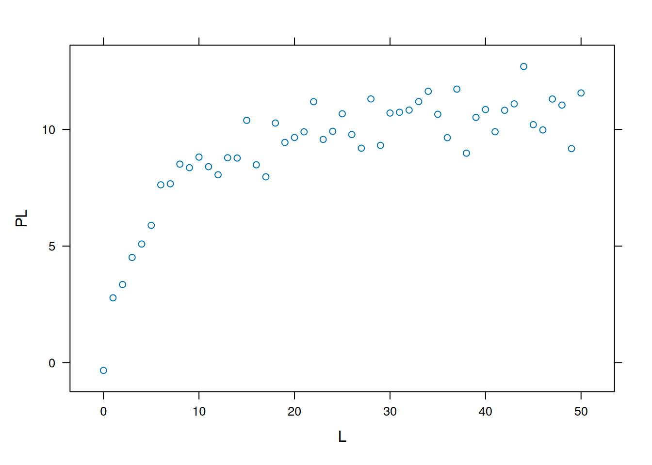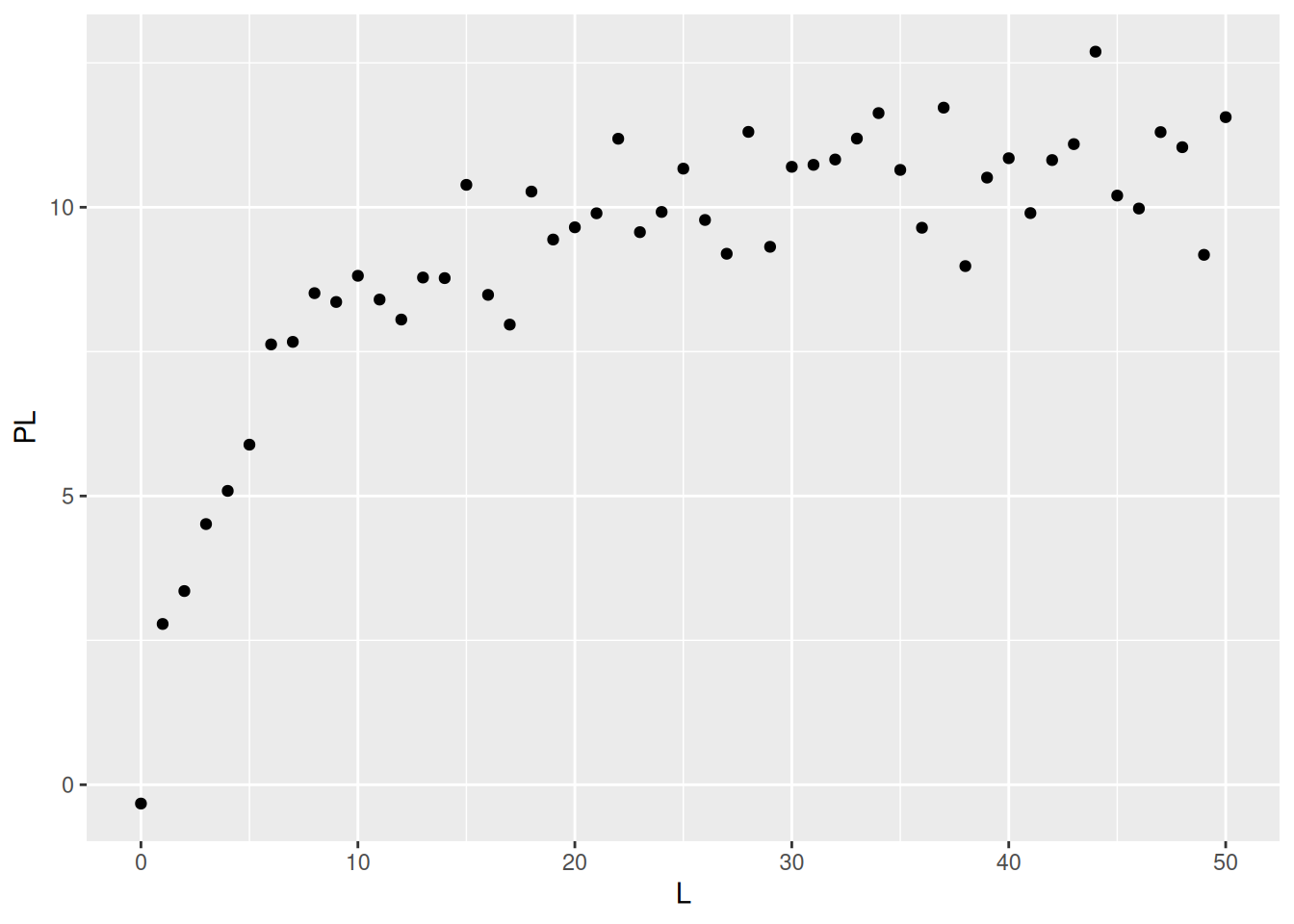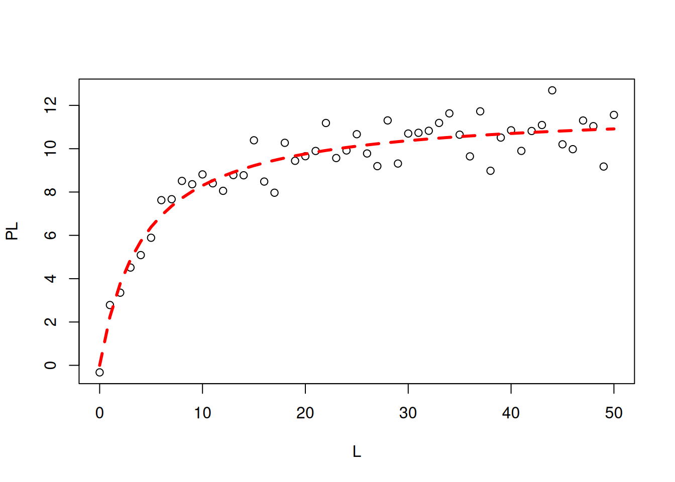 PL <- ((runif(1, 10, 20) * L)/(runif(1, 0, 10) + L)) + rnorm(51, 0, 1)