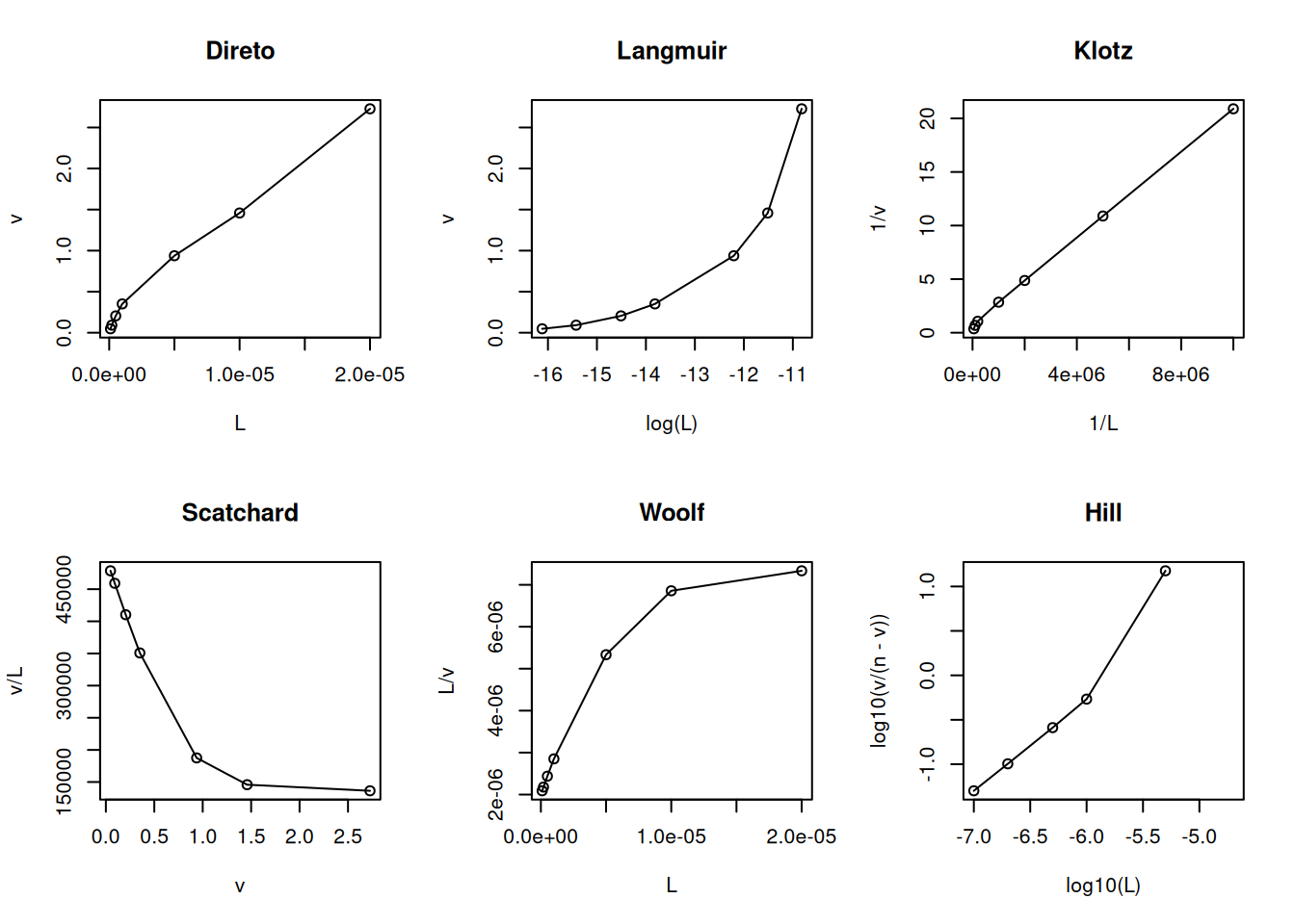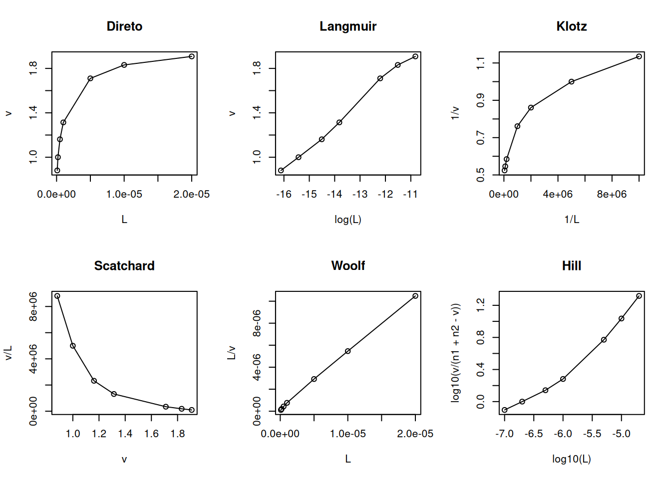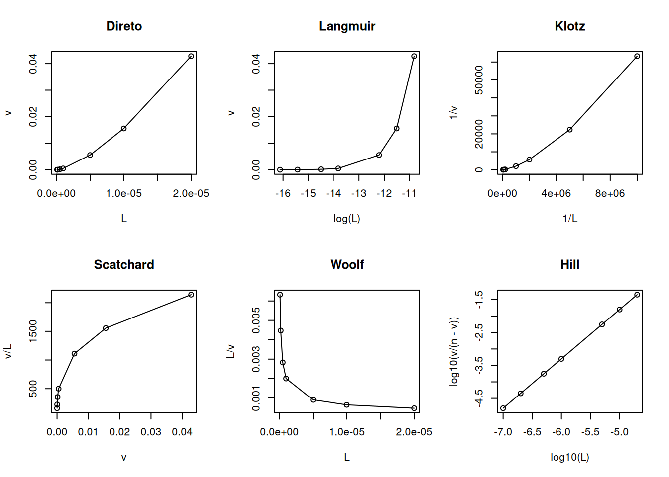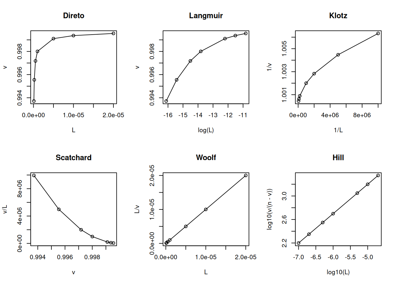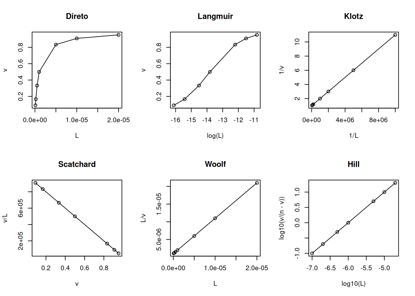 Mantida essa similaridade com o formalismo da equação de Michaelis-Menten, da mesma maneira decorrem as linearizações para a Equação 6.4), bem como ajustes não lineares à mesma, na busca de uma solução analítica para os parâmetros termodinâmicos Kd e n. Exemplificando um trecho de código para as linearizações mais comuns no tratamento de dados de interação ligante-proteína: