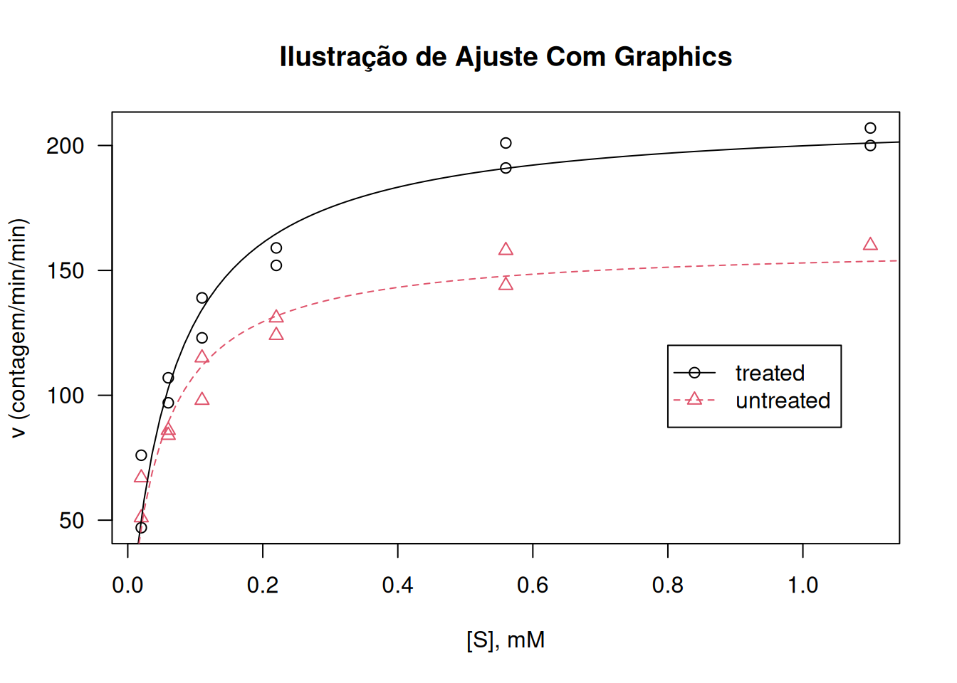 Agora precisamos utilizar o comando ‘nls’ para o ajuste não linear, sobreposição da curva teórica, e tabela estatística de resultados: